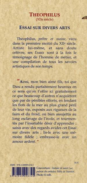 « Ainsi, mon bien aimé fils, toi que Dieu a rendu parfaitement heureux en ce sens qu'on t'offre ici gratuitement ce que beaucoup d'autres n'acquièrent que par de pénibles efforts, en fendant les flots de la mer au plus grand péril de leur vie, exposés aux rigueurs de la faim et du froid, ou bien assujettis au long esclavage de l'école, et tourmentés par l'insatiable désir d'apprendre ; saisis avec des regards avides cet Essai sur divers arts ; lis-le avec une mémoire fidèle ; embrasse-le avec un amour ardent. »