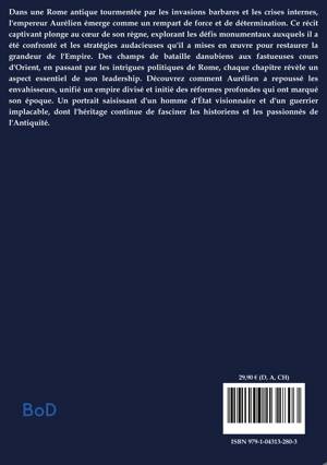 Dans une Rome antique tourmentée par les invasions barbares et les crises internes, l'empereur Aurélien émerge comme un rempart de force et de détermination. Ce récit captivant plonge au coeur de son règne, explorant les défis monumentaux auxquels il a été confronté et les stratégies audacieuses qu'il a mises en oeuvre pour restaurer la grandeur de l'Empire. Des champs de bataille danubiens aux fastueuses cours d'Orient, en passant par les intrigues politiques de Rome, chaque chapitre révèle un aspect essentiel de son leadership. Découvrez comment Aurélien a repoussé les envahisseurs, unifié un empire divisé et initié des réformes profondes qui ont marqué son époque. Un portrait saisissant d'un homme d'État visionnaire et d'un guerrier implacable, dont l'héritage continue de fasciner les historiens et les passionnés de l'Antiquité.