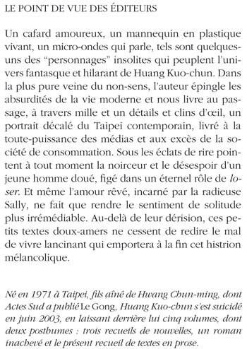 «Né en 1971 à Taipei, fils aîné de Hwang Chun-ming, dont Actes Sud a publié Le Gong, Huang Kuo-chun s'est suicidé en juin 2003, en laissant derrière lui cinq volumes, dont deux posthumes : trois recueils de nouvelles, un roman inachevé et le présent recueil de textes en prose.»