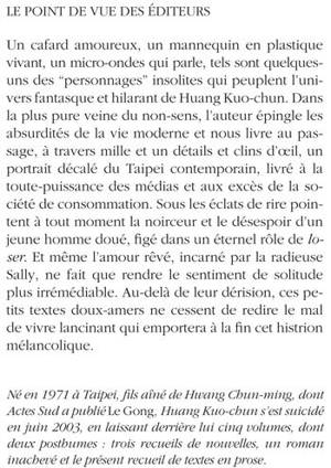 Un cafard amoureux, un mannequin en plastique vivant, un micro-ondes qui parle, tels sont quelquesuns des "personnages" insolites qui peuplent l'univers fantasque et hilarant de Huang Kuo-chun. Dans la plus pure veine du non-sens, l'auteur épingle les absurdités de la vie moderne et nous livre au passage, à travers mille et un détails et clins d'oeil, un portrait décalé du Taipei contemporain, livré à la toute-puissance des médias et aux excès de la société de consommation. Sous les éclats de rire pointent à tout moment la noirceur et le désespoir d'un jeune homme doué, figé dans un éternel rôle de loser. Et même l'amour rêvé, incarné par la radieuse Sally, ne fait que rendre le sentiment de solitude plus irrémédiable. Au-delà de leur dérision, ces petits textes doux-amers ne cessent de redire le mal de vivre lancinant qui emportera à la fi n cet histrion mélancolique.