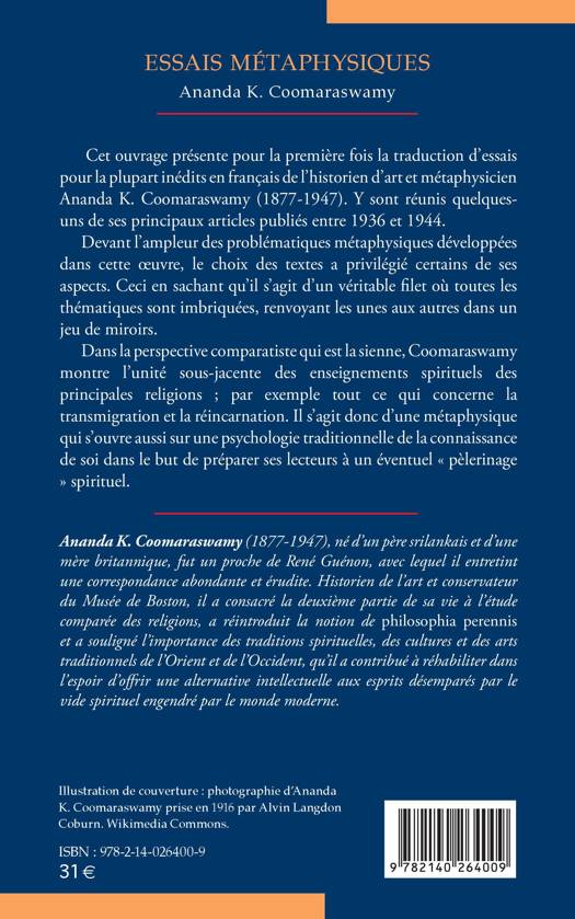 Cet ouvrage présente pour la première fois la traduction d'essais inédits en français de l'historien d'art et métaphysicien Ananda K. Coomaraswamy (1877-1947). Y sont réunis quelques-uns de ses principaux articles publiés entre 1936 et 1944. Devant l'ampleur des problématiques métaphysiques développées dans cette oeuvre, le choix des textes a privilégié certains de ses aspects. Ceci en sachant qu'il s'agit d'un véritable filet où toutes les thématiques sont imbriquées, renvoyant les unes aux autres dans un jeu de miroirs. Dans la perspective comparatiste qui est la sienne, Coomaraswamy montre l'unité sous-jacente des enseignements spirituels des principales religions ; par exemple tout ce qui concerne la transmigration et la réincarnation. Il s'agit donc d'une métaphysique qui s'ouvre aussi sur une psychologie traditionnelle de la connaissance de soi dans le but de préparer ses lecteurs à un éventuel « pèlerinage » spirituel.