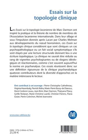 Les Essais sur la topologie clinique considèrent que sont cliniques un cas psychopathologique ou un fait social symptomatique s'ils sont étayés par une lecture structurale donnant lieu à une écriture topologique. Ces essais réunissent donc sur une définition rigoureuse de la clinique psychanalytique quatorze contributeurs dont la diversité d'approche en la matière intéressera le lecteur.