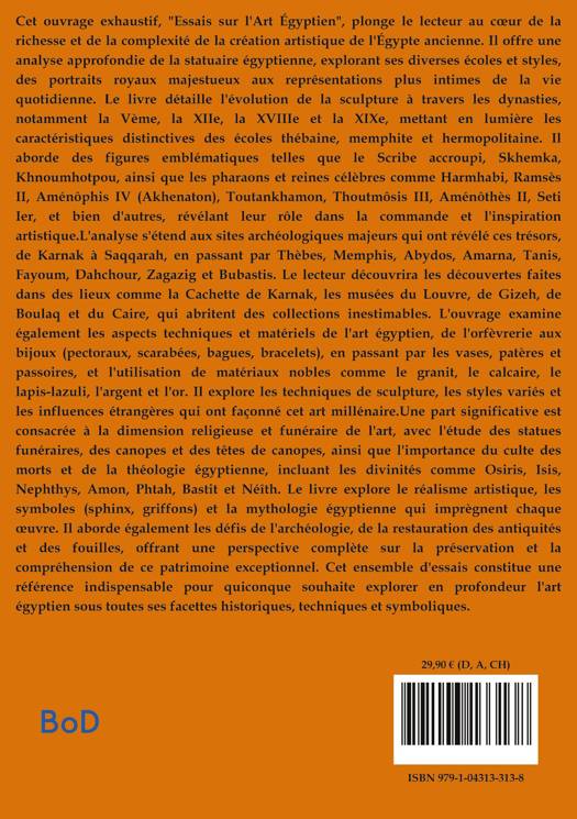 Cet ouvrage exhaustif, "Essais sur l'Art Égyptien", plonge le lecteur au coeur de la richesse et de la complexité de la création artistique de l'Égypte ancienne. Il offre une analyse approfondie de la statuaire égyptienne, explorant ses diverses écoles et styles, des portraits royaux majestueux aux représentations plus intimes de la vie quotidienne. Le livre détaille l'évolution de la sculpture à travers les dynasties, notamment la Vème, la XIIe, la XVIIIe et la XIXe, mettant en lumière les caractéristiques distinctives des écoles thébaine, memphite et hermopolitaine. Il aborde des figures emblématiques telles que le Scribe accroupi, Skhemka, Khnoumhotpou, ainsi que les pharaons et reines célèbres comme Harmhabi, Ramsès II, Aménôphis IV (Akhenaton), Toutankhamon, Thoutmôsis III, Aménôthès II, Seti Ier, et bien d'autres, révélant leur rôle dans la commande et l'inspiration artistique.L'analyse s'étend aux sites archéologiques majeurs qui ont révélé ces trésors, de Karnak à Saqqarah, en passant par Thèbes, Memphis, Abydos, Amarna, Tanis, Fayoum, Dahchour, Zagazig et Bubastis. Le lecteur découvrira les découvertes faites dans des lieux comme la Cachette de Karnak, les musées du Louvre, de Gizeh, de Boulaq et du Caire, qui abritent des collections inestimables. L'ouvrage examine également les aspects techniques et matériels de l'art égyptien, de l'orfèvrerie aux bijoux (pectoraux, scarabées, bagues, bracelets), en passant par les vases, patères et passoires, et l'utilisation de matériaux nobles comme le granit, le calcaire, le lapis-lazuli, l'argent et l'or. Il explore les techniques de sculpture, les styles variés et les influences étrangères qui ont façonné cet art millénaire.Une part significative est consacrée à la dimension religieuse et funéraire de l'art, avec l'étude des statues funéraires, des canopes et des têtes de canopes, ainsi que l'importance du culte des morts et de la théologie égyptienne, incluant les divinités comme Osiris, Isis, Nephthys, Amon, Phtah, Bastit et Néîth. Le livre explore le réalisme artistique, les symboles (sphinx, griffons) et la mythologie égyptienne qui imprègnent chaque oeuvre. Il aborde également les défis de l'archéologie, de la restauration des antiquités et des fouilles, offrant une perspective complète sur la préservation et la compréhension de ce patrimoine exceptionnel. Cet ensemble d'essais constitue une référence indispensable pour quiconque souhaite explorer en profondeur l'art égyptien sous toutes ses facettes historiques, techniques et symboliques.
