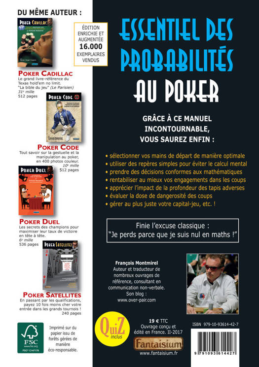 Finie l’excuse classique : “Je perds au poker parce que je suis nul en maths !” Grâce à ce manuel devenu incontournable, vous saurez enfin : sélectionner vos mains de départ de manière optimale ; utiliser des repères simples pour éviter le calcul mental ; prendre des décisions conformes aux mathématiques ; rentabiliser au mieux vos engagements dans les coups ; apprécier l’impact de la profondeur des tapis adverses ; évaluer la dose de dangerosité des coups ; gérer au plus juste votre capital-jeu, etc. ! Cette nouvelle version tout en couleur contient plus d’exemples, des explications plus pédagogiques, des concepts plus nombreux… et aussi plus de pages ! (16000 exemplaires vendus).