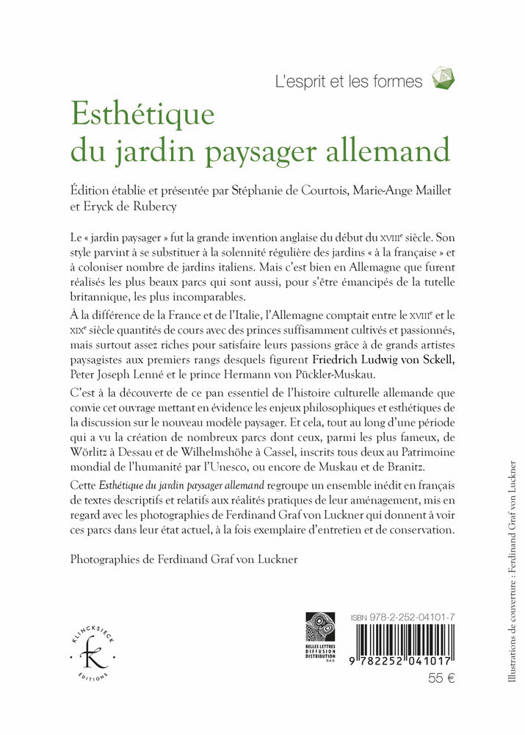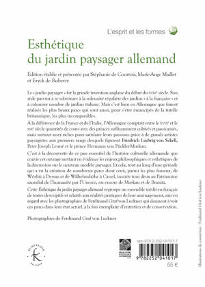 Le jardin paysager fut la grande invention anglaise du debut du XVIIIe siecle. Son style parvint a se substituer a la solennite reguliere des jardins a la francaise et a coloniser nombre de jardins italiens. Mais c'est bien en Allemagne que furent realises les plus beaux parcs qui sont aussi, pour s'etre emancipes de la tutelle britannique, les plus incomparables. A la difference de la France et de l'Italie, l'Allemagne comptait entre le XVIIIe et le XIXe siecle quantites de cours avec des princes suffisamment cultives et passionnes, mais surtout assez riches pour satisfaire leurs passions grace a de grands artistes paysagistes aux premiers rangs desquels figurent Friedrich Ludwig von Sckell, Peter Joseph Lenne et le prince Hermann von Puckler-Muskau. C'est a la decouverte de ce pan essentiel de l'histoire culturelle allemande que convie cet ouvrage mettant en evidence les enjeux philosophiques et esthetiques de la discussion sur le nouveau modele paysager. Et cela, tout au long d'une periode qui a vu la creation de nombreux parcs dont ceux, parmi les plus fameux, de Worlitz a Dessau et de Wilhelmshohe a Cassel, inscrits tous deux au Patrimoine mondial de l'humanite par l'Unesco, ou encore de Muskau et de Branitz. Cette Esthetique du jardin paysager allemand regroupe un ensemble inedit en francais de textes descriptifs et relatifs aux realites pratiques de leur amenagement, mis en regard avec les photographies de Ferdinand Graf von Luckner qui donnent a voir ces parcs dans leur etat actuel, a la fois exemplaire d'entretien et de conservation.