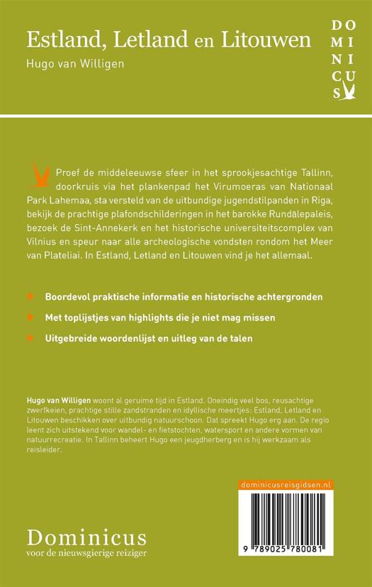 Ontdek de Baltische staten Estland, Letland en Litouwen op vakantie met deze Dominicus-reisgids en verken Tallinn, Saaremaa, Riga, Vilnius, de nationale parken en meer. Proef de middeleeuwse sfeer in het sprookjesachtige Tallinn, doorkruis via het plankenpad het Virumoeras van nationaal park Lahemaa en sta versteld van de bezienswaardigheden en uitbundige jugendstilpanden in Riga. Bekijk ook de prachtige plafondschilderingen in het barokke Rundalepaleis, bezoek de Sint-Annekerk en het historische universiteitscomplex van Vilnius en speur naar alle archeologische vondsten rondom het Meer van Plateliai. Beleef de ultieme vakantie In Estland, Letland en Litouwen. Deze reisgids zit bomvol praktische informatie, handige overzichtskaarten, sfeervolle foto's, historische achtergronden en uitgebreide culturele achtergrondinformatie. Bovendien zijn Dominicus-reisgidsen altijd up-to-date en geschreven door Nederlandstalige experts. Hugo van Willigen woont al geruime tijd in Estland. In Tallinn beheert hij een jeugdherberg en is hij werkzaam als reisleider.