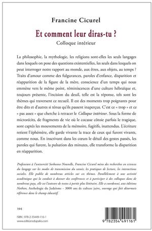 La philosophie, la mythologie, les religions sont-elles les seuls langages dans lesquels on pose des questions existentielles, les seuls dans lesquels on peut interroger notre rapport au monde, aux êtres, aux objets, au temps ? Traits d’amour comme des fulgurances, paroles d’enfance, disparition et réapparition de la figure de la mère, conscience d’un temps qui nous emmène vers le même point, réminiscences d’une culture hébraïque et, toujours présente, l’incision du deuil, telle est la réponse, tels sont les thèmes qui traversent ce recueil. Il est des moments trop poignants pour être dits et d’autres si ténus qu’ils passent inaperçus. C’est ce "trop" et ce "pas assez" que cherche à retracer le "Colloque intérieur". Sous la forme de microrécits, de fragments de vie où le cocasse côtoie parfois le tragique, sont captés les mouvements de la mémoire, fugitifs, inattendus. L’écriture retient l’éphémère, elle garde vivante la trace de ceux qui furent vivants, comme nous. En inscrivant dans les coeurs le détail des gestes passés, les paroles qui furent, la pulsation des minutes, elle transforme la disparition en réapparition. Professeure à l’université Sorbonne Nouvelle, Francine Cicurel mène des recherches en sciences du langage sur les modes de transmission du savoir, les pratiques de lecture, les interactions sociales. Elle publie de nombreux articles sur ces thèmes. Parallèlement à une activité académique qui la conduit à donner des conférences et à participer à des colloques dans de nombreux pays, elle est l’auteure de textes à portée plus littéraire. Elle a coordonné, aux éditions Nathan, "Anthologie du Judaïsme - 3000 ans de culture juive", ouvrage qui fait désormais référence dans le champ éducatif.