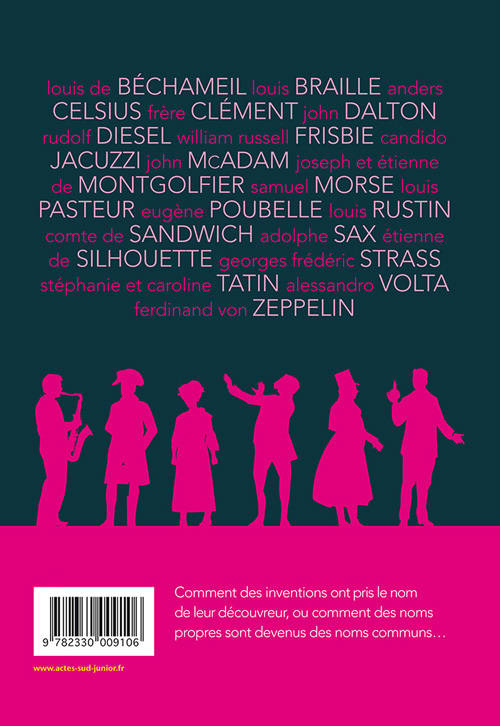 En 1765, parce qu'il ne voulait pas interrompre sa partie de cartes, le comte de Sandwich se fit apporter un encas entre deux tranches de pain : le célèbre repas sur le pouce était né ! En 1829, le jeune aveugle Louis Braille conçoit un alphabet composé de points en relief pour permettre aux aveugles de lire et de communiquer... Qu'ils soient ingénieurs, militaires, artistes ou savants, chacun de ces hommes et de ces femmes ont un jour imaginé un objet, un mets, un langage, un engin, un système, qui s'est inscrit dans notre quotidien sous leur nom. De la clémentine à la poubelle, cet ouvrage raconte l'histoire de vingt-deux noms propres devenus des noms communs. Les images très graphiques de Dimitri Delmas, qui jouent avec les silhouettes et les formes des objets, servent avec une élégante fantaisie le propos insolite.