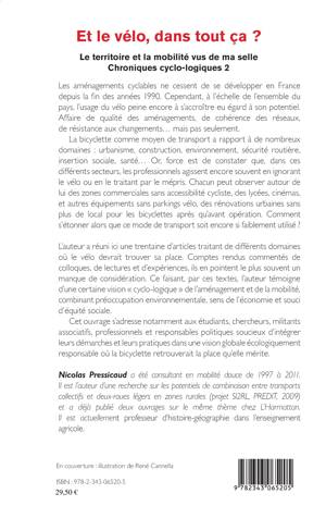 L'auteur a réuni ici une trentaine d'articles traitant de différents domaines où le vélo devrait trouver sa place. Comptes rendus commentés de colloques, de lectures et d'expériences, ils en pointent le plus souvent un manque de considération. Ce faisant, par ces textes, l'auteur témoigne d'une certaine vision "cyclo-logique" de l'aménagement et de la mobilité, combinant préoccupation environnementale, sens de l'économie et souci d'équité sociale.