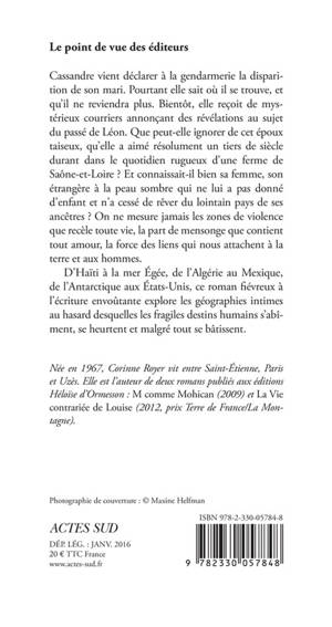 Cassandre vient déclarer à la gendarmerie la disparition de son mari. Pourtant elle sait où il se trouve, et qu'il ne reviendra plus. Bientôt, elle reçoit de mystérieux courriers annonçant des révélations au sujet du passé de Léon. Que peut-elle ignorer de cet époux taiseux, qu'elle a aimé résolument un tiers de siècle durant dans le quotidien rugueux d'une ferme de Saône-et-Loire ? Et connaissait-il bien sa femme, son étrangère à la peau sombre qui ne lui a pas donné d'enfant et n'a cessé de rêver du lointain pays de ses ancêtres ? On ne mesure jamais les zones de violence que recèle toute vie, la part de mensonge que contient tout amour, la force des liens qui nous attachent à la terre et aux hommes.