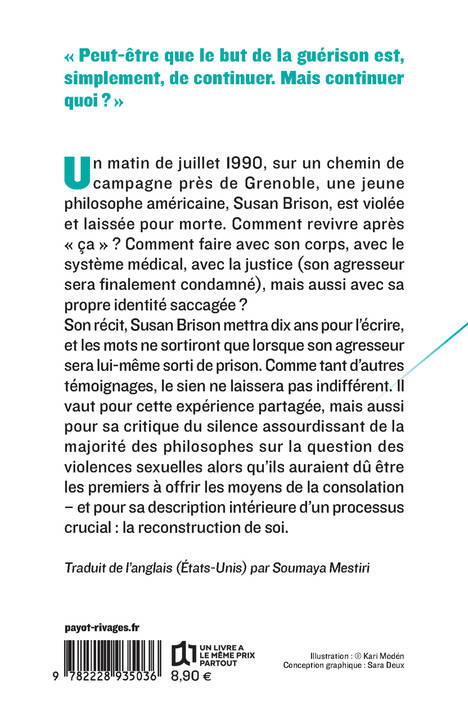 Un matin de juillet 1990, sur un chemin de campagne près de Grenoble, une jeune philosophe américaine, Susan Brison, est violée et laissée pour morte. Comment revivre après "ça" ? Comment faire avec son corps, avec le système médical, avec la justice (son agresseur sera finalement condamné), mais aussi avec sa propre identité saccagée ? Son récit, Susan Brison mettra dix ans pour l'écrire, et les mots ne sortiront que lorsque son agresseur sera lui-même sorti de prison. Comme tant d'autres témoignages, le sien ne laissera pas indifférent. Il vaut pour cette expérience partagée, mais aussi pour sa critique du silence assourdissant de la majorité des philosophes sur la question des violences sexuelles alors qu'ils auraient dû être les premiers à offrir les moyens de la consolation - et pour sa description intérieure d'un processus crucial : la reconstruction de soi.