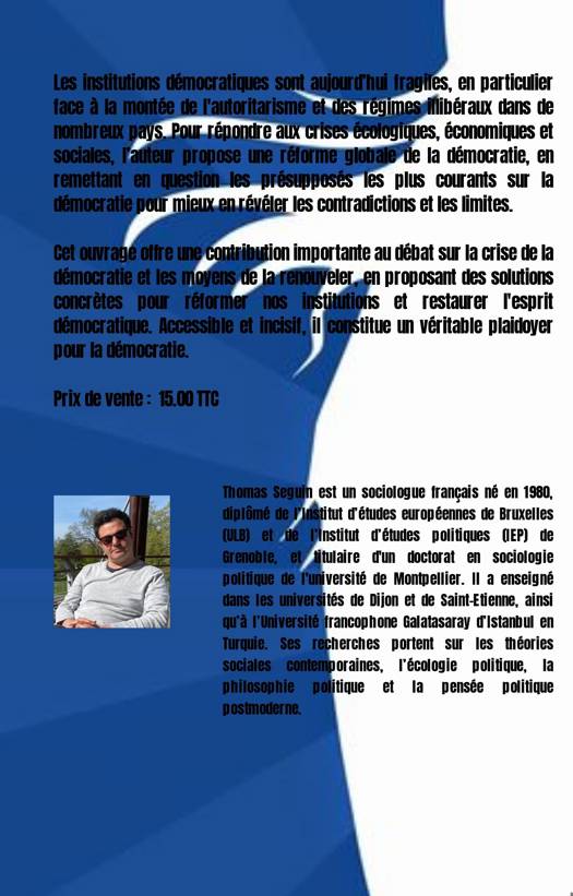 Les institutions démocratiques sont aujourd'hui fragiles, en particulier face à la montée de l'autoritarisme et des régimes illibéraux dans de nombreux pays. Pour répondre aux crises écologiques, économiques et sociales l'auteur propose une réforme globale de la démocratie, en remettant en question les presupposés les plus courants sur la démocratie pour mieux en révéler les contradictions et les limites.