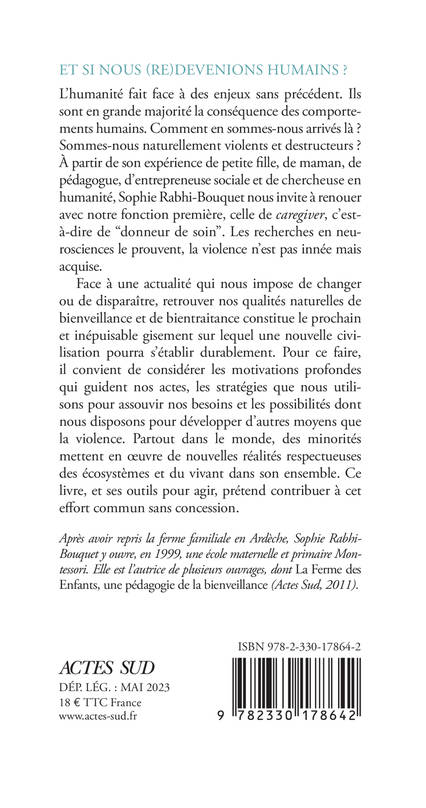 L'humanité fait face à des enjeux sans précédent. Ils sont en grande majorité la conséquence des comportements humains. Comment en s ommes-nous arrivés là ? Sommes-nous naturellement violents et destructeurs ? À partir de son expérience de petite fille, de maman, de pédagogue, d'entrepreneuse sociale et de chercheuse en humanité, Sophie Rabhi-Bouquet nous invite à renouer avec notre fonction première, celle de caregiver, c'est-à-dire de "donneur de soin". Les recherches en neurosciences le prouvent, la violence n'est pas innée mais acquise. Face à une actualité qui nous impose de changer ou de disparaître, retrouver nos qualités naturelles de bienveillance et de bientraitance constitue le prochain et inépuisable gisement sur lequel une nouvelle civilisation pourra s'établir durablement. Pour ce faire, il convient de considérer les motivations profondes qui guident nos actes, les stratégies que nous utilisons pour assouvir nos besoins et les possibilités dont nous disposons pour développer d'autres moyens que la violence. Partout dans le monde, des minorités mettent en oeuvre de nouvelles réalités respectueuses des écosystèmes et du vivant dans son ensemble. Ce livre, et ses outils pour agir, prétend contribuer à cet effort commun sans concession.