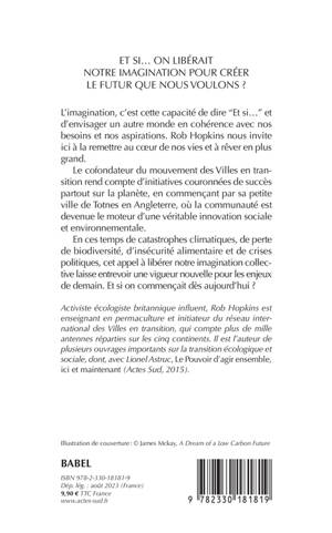 L'imagination, c'est cette capacité de dire "Et si..." et d'envisager un autre monde en cohérence avec nos besoins et nos aspirations. Rob Hopkins nous invite ici à la remettre au coeur de nos vies et à rêver en plus grand. Le cofondateur du mouvement des Villes en transition rend compte d'initiatives couronnées de succès partout sur la planète, en commençant par sa petite ville de Totnes en Angleterre, où la communauté est devenue le moteur d'une véritable innovation sociale et envi ronnementale. En ces temps de catastrophes climatiques, de perte de biodiversité, d'insécurité alimentaire et de crises politiques, cet appel à libérer notre imagination collective laisse entrevoir une vigueur nouvelle pour les enjeux de demain. Et si on commençait dès aujourd'hui ?