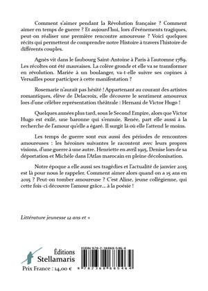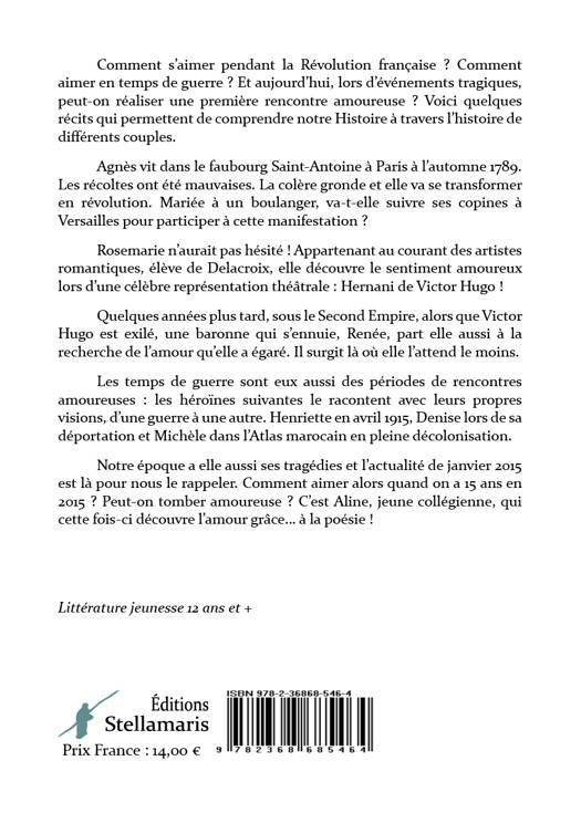Comment s’aimer pendant la Révolution française ? Comment aimer en temps de guerre ? Et aujourd’hui, lors d’événements tragiques, peut-on réaliser une première rencontre amoureuse ? Voici quelques récits qui permettent de comprendre notre Histoire à travers l’histoire de différents couples. Agnès vit dans le faubourg Saint-Antoine à Paris à l’automne 1789. Les récoltes ont été mauvaises. La colère gronde et elle va se transformer en révolution. Mariée à un boulanger, va-t-elle suivre ses copines à Versailles pour participer à cette manifestation ? Rosemarie n’aurait pas hésité ! Appartenant au courant des artistes romantiques, élève de Delacroix, elle découvre le sentiment amoureux lors d’une célèbre représentation théâtrale : Hernani de Victor Hugo ! Quelques années plus tard, sous le Second Empire, alors que Victor Hugo est exilé, une baronne qui s’ennuie, Renée, part elle aussi à la recherche de l’amour qu’elle a égaré. Il surgit là où elle l’attend le moins. Les temps de guerre sont eux aussi des périodes de rencontres amoureuses : les héroïnes suivantes le racontent avec leurs propres visions, d’une guerre à une autre. Henriette en avril 1915, Denise lors de sa déportation et Michèle dans l’Atlas marocain en pleine décolonisation. Notre époque a elle aussi ses tragédies et l’actualité de janvier 2015 est là pour nous le rappeler. Comment aimer alors quand on a 15 ans en 2015 ? Peut-on tomber amoureuse ? C’est Aline, jeune collégienne, qui cette fois-ci découvre l’amour grâce… à la poésie ! Littérature jeunesse 12 ans et +