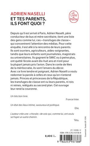 Depuis qu’il est arrivé à Paris, Adrien Naselli, père conducteur de bus et mère secrétaire, tient une liste des gens comme lui, ces « transfuges de classe » qui concentrent l’attention des médias. Pour cette enquête, il est allé à la rencontre de leurs parents. Ils sont ouvriers, agriculteurs, aides-soignantes, tandis que leurs enfants sont journalistes, magistrats ou universitaires. Ils gagnent le SMIC ou à peine plus, ont quitté l’école avant dix-huit ans et n’ont pour la plupart jamais pris l’avion. Dans le conte de fées de la méritocratie, ils sont l’envers du décor.