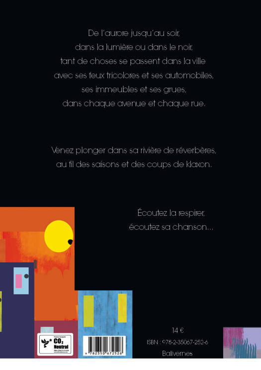 Quand la ville s’éveille, elle étire ses grands bras de fer. Ses feux tricolores la font parfois rougir. Elle lance des petites voitures sur son grand circuit, se gonfle de joie quand le soleil est là et pleure avec les nuages, parfois. Le soir venu, elle allume ses réverbères dès la nuit tombée et danse, danse, et jamais ne s’éteint...