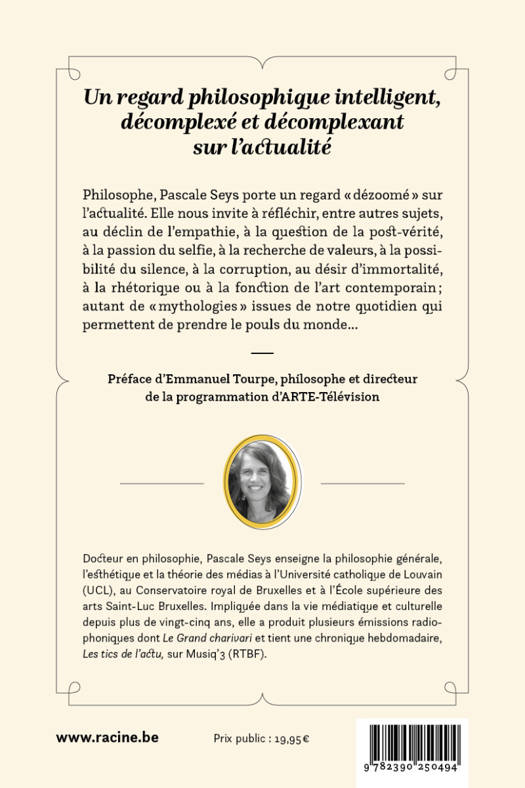 Philosophe, Pascale Seys porte un regard « dézoomé » sur l'actualité. Elle nous invite à réfléchir, entre autres sujets, au déclin de l'empathie, à la question de la post-vérité, à la passion du selfie, à la recherche de valeurs, à la possibilité du silence, à la corruption, au désir d'immortalité, à la rhétorique ou à la fonction de l'art contemporain ; autant de « mythologies » issues de notre quotidien qui permettent de prendre le pouls du monde... Préface d'Emmanuel Tourpe, philosophe et directeur de la programmation d'ARTE-Télévision