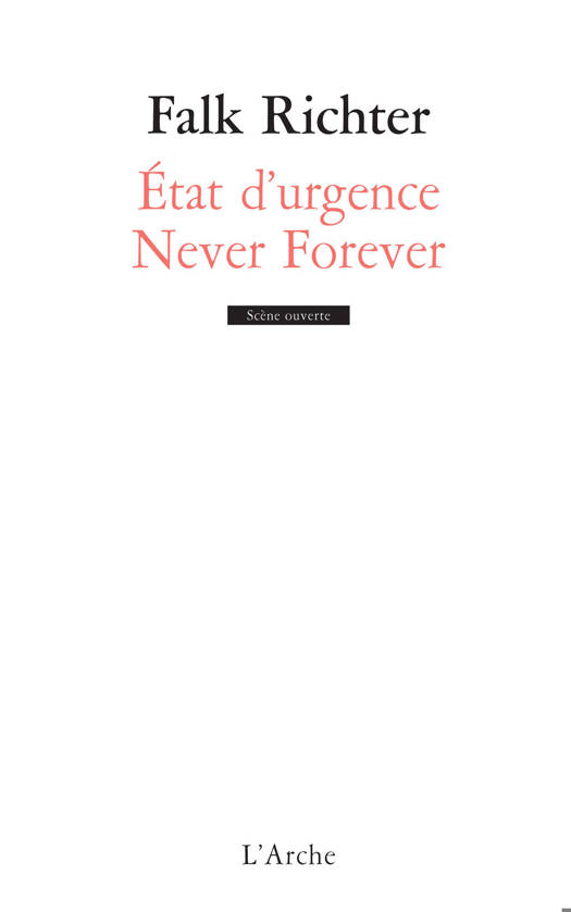Deux pièces sur le désir. «Never Forever» développe le paradoxe inhérent au désir humain : besoin inavoué d'être vu, aimé, remarqué et désenchantement proche de la nausée de devoir se comparer toujours à l'autre afin de se repérer socialement. Dans «État d'urgence», pièce entre l'univers de Georges Orwell et celui du "Truman Show", Richter interroge les mécanismes de notre société de surveillance et renverse les schémas classiques de l'intimité.