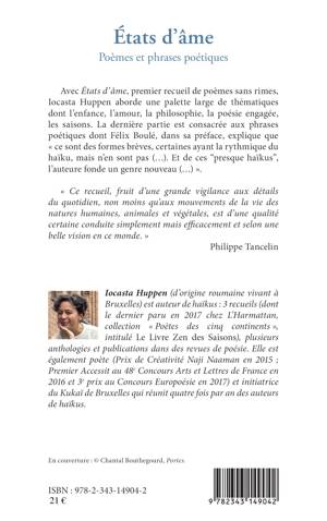 Avec Etats d'âmes, premier recueil de poèmes sans rimes, Iocasta Huppen aborde une palette large de thématiques telles que l'enfance, l'amour, la philosophie, la poésie engagée, les saisons. Ce recueil est le fruit d'une grande vigilance aux détails du quotidien, non moins qu'aux mouvements de la vie des natures humaines, animales et végétales. Image de couverture de Chantal Bouthegourd, Portes.