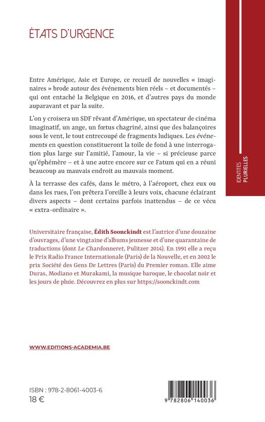 Entre Amérique, Asie et Europe, ce recueil de nouvelles « imaginaires » brode autour des événements bien réels – et documentés – qui ont entaché la Belgique en 2016, et d’autres pays du monde auparavant et par la suite. L’on y croisera un SDF rêvant d’Amérique, un spectateur de cinéma imaginatif, un ange, un fœtus chagriné, ainsi que des balançoires sous le vent, le tout entrecoupé de fragments ludiques. Les événements en question constitueront la toile de fond à une interrogation plus large sur l’amitié, l’amour, la vie – si précieuse parce qu’éphémère – et à une autre encore sur ce Fatum qui en a réuni beaucoup au mauvais endroit au mauvais moment. À la terrasse des cafés, dans le métro, à l’aéroport, chez eux ou dans les rues, l’on prêtera l’oreille à leurs voix, chacune éclairant divers aspects – dont certains parfois inattendus – de ce vécu « extra-ordinaire ».