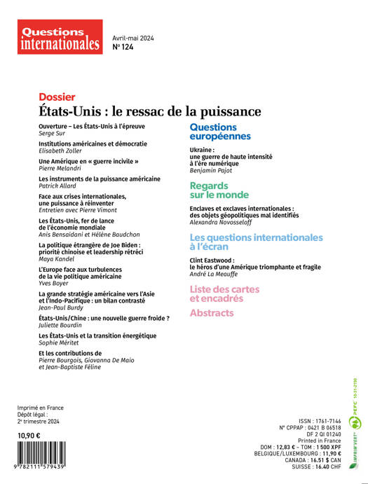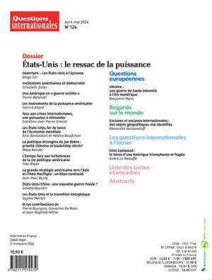 Les affaires intérieures d’une puissance telle que les Etats-Unis pèsent sur la destinée du monde entier. Alors que débute la campagne électorale en vue de la présidentielle américaine de novembre 2024, Questions internationales s’interroge sur les mutations en profondeur de l’Amérique : une société américaine polarisée, une vie politique et institutionnelle malmenée par les atteintes à la démocratie depuis l’ère Trump, une puissance diplomatique ou militaire active sur tous les fronts (Ukraine, Chine, Moyen-Orient…), une hégémonie économique qui ne se dément pas... Avec la question suivante à la clé : quel sera le rôle de la puissance américaine dans la recomposition en cours de l’ordre international ?