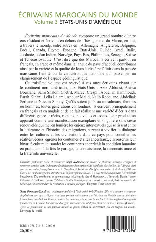Ce troisième volume est réservé à ces onze écrivains vivant sur le continent nord-américain, aux États-Unis : Aziz Abbassi, Anissa Bouziane, Sami Shalom Chetrit, Marcel Crespil, Abdellah Hammoudi, Farah Kinani, Leila Lalami, Anouar Majid, Najib Redouane, Abdelhak Serhane et Nessim Sibony. Dans la lignée des deux volumes précédents, l'ouvrage jette un éclairage particulier sur l'originalité, l'intensité, la profondeur et la diversité de des écrivains marocains dans le monde.