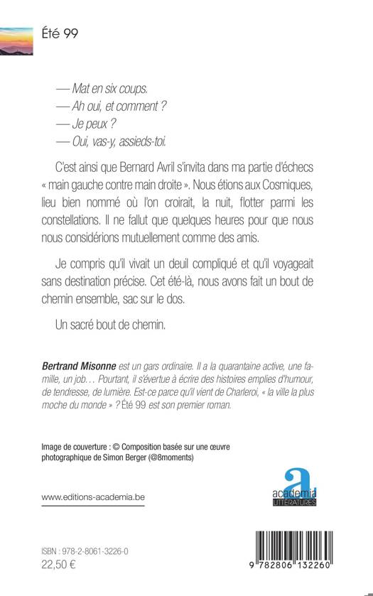 Papa est mort, on l'enterre Samedi . Cette annonce arrache Bernard Avril à sa vie de bohème. Son père lui a laissé une lettre posthume; elle est si décevante. Il prend la route, comme un antidote à sa colère, et rencontre un nouvel ami. À la fois candide et philosophe, c'est un compagnon d'aventure idéal. Avec son aide, Bernard trouvera-t-il un sens à son deuil compliqué ? Roman de voyage, Été 99 parle de ces étincelles du destin qui, parfois, nous font naître en nous-mêmes.