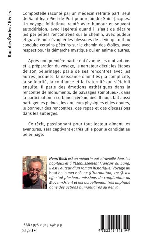 Compostelle raconté par un médecin retraité parti seul de Saint-Jean-Pied-de-Port pour rejoindre Saint-Jacques. Un voyage initiatique relaté avec humour et souvent autodérision, avec légèreté quand il s'agit de décrire les péripéties rencontrées sur le chemin, avec pudeur et gravité pour évoquer les blessures de la vie qui ont pu conduire certains pèlerins sur le chemin des étoiles, avec respect pour la démarche mystique qui en anime d'autres.