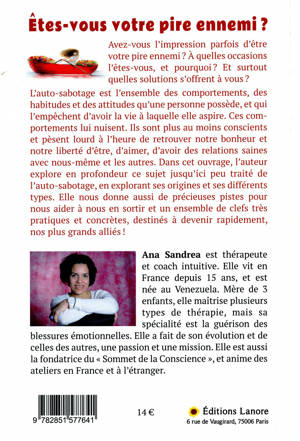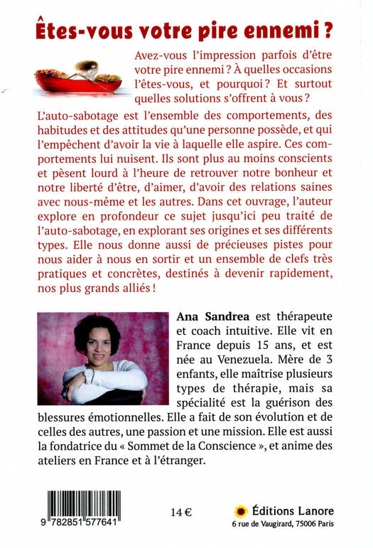 Avez-vous l'impression parfois d'être votre pire ennemi ? A quelles occasions l'êtes-vous, et pourquoi ? Et surtout quelles solutions s'offrent à vous ? L'auto-sabotage est l'ensemble des comportements, des habitudes et des attitudes qu'une personne possède, et qui l'empêchent d'avoir la vie à laquelle elle aspire. Ces comportements lui nuisent. Ils sont plus au moins conscients et pèsent lourd à l'heure de retrouver notre bonheur et notre liberté d'être, d'aimer, d'avoir des relations saines avec nous-même et les autres. Dans cet ouvrage, l'auteur explore en profondeur ce sujet jusqu'ici peu traité de l'auto-sabotage, en explorant ses origines et ses différents types. Elle nous donne aussi de précieuses pistes pour nous aider à nous en sortir et un ensemble de clefs très pratiques et concrètes, destinés, à devenir rapidement, nos plus grands alliés !