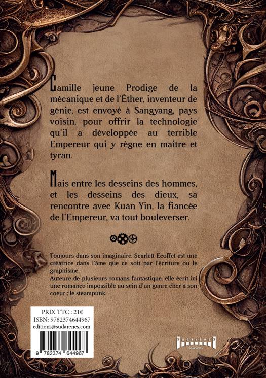 Camille, jeune Prodige de la mécanique et de l'Éther, inventeur de génie, est envoyé à Sangyang, pays voisin, pour offrir la technologie qu'il a développée au terrible Empereur qui y règne en maître et tyran. Mais entre les desseins des hommes, et les desseins des dieux, sa rencontre avec Kuan Yin, la fiancée de l'Empereur, va tout bouleverser. À PROPOS DE L'AUTRICE Scarlett Marina Ecoffet Née en 1986, passionnée d'écriture depuis l'adolescence, rêveuse intempestive, toujours dans son imaginaire, elle est une créatrice dans l'âme. Son parcours scolaire est composé de littérature et d'une carrière créative en tant que Designer-Web.