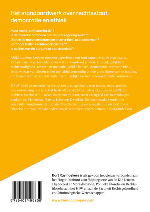 Ethiek, recht en samenleving brengt het grensgebied tussen ethiek, recht, politiek en samenleving in kaart. Het besteedt aandacht aan klassieke figuren als Plato, Hobbes, Machiavelli, Locke, Rousseau en Kant, maar evengoed aan hedendaagse denkers als Habermas, Rawls, Lefort en Dworkin. De lezer maakt kennis met een aantal kernmomenten uit de ethische traditie en vraagstelling en leert zo de ethische dimensie van de hedendaagse samenlevingsproblemen te (her)ontdekken.