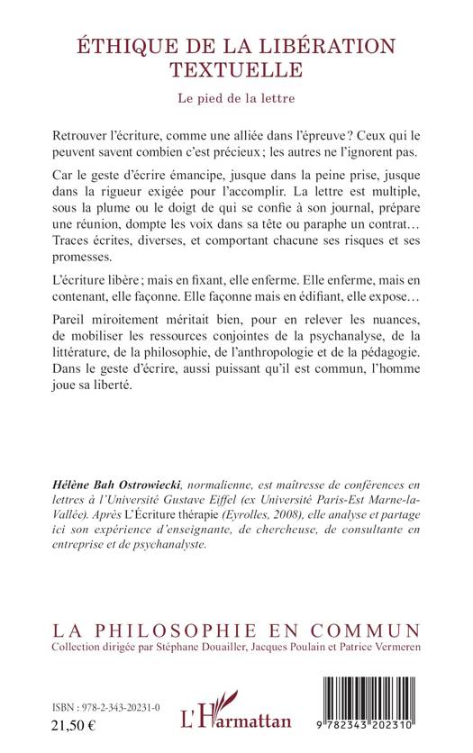 Retrouver l'écriture comme une alliée dans l'épreuve ? Ceux qui le peuvent savent combien c'est précieux ; les autres ne l'ignorent pas. Car le geste d'écrire émancipe jusque dans la peine prise, jusque dans la rigueur exigée pour l'accomplir. L'écriture libère, mais en fixant, elle enferme. Elle enferme, mais en contenant, elle façonne. Elle façonne mais en édifiant elle expose ... Pareil miroitement méritait bien pour en relever les nuances, de mobiliser les ressources conjointes de la psychanlyse, de la littérature, de la philosophie, de l'anthropologie et de la pédagogie.