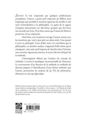 L’interrogation débute par l’analyse du concept de méthode, à travers le paradigme incontournable de Descartes. Le renversement d’un discours de la méthode en méthode du discours prépare à l’identification d’une ultime méthode, que l’auteur, poursuivant les analyses de La Fin des phénomènes, thématise en tant que figurologie.