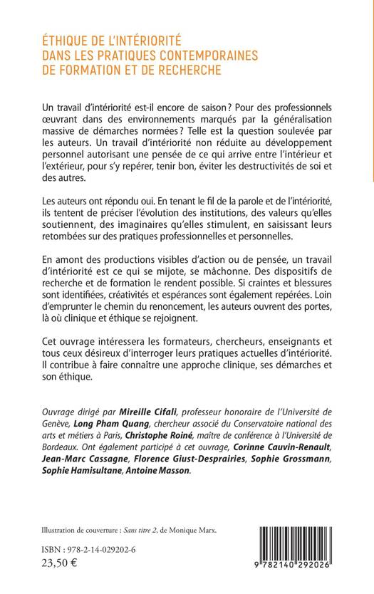 Un travail d'intériorité est-il encore de saison ? Pour des professionnels oeuvrant dans des environnements marqués par la généralisation massive de démarches normées ? Telle est la question soulevée par les auteurs. Un travail d'intériorité non réduite au développement personnel autorisant une pensée de ce qui arrive entre l'intérieur et l'extérieur, pour s'y repérer, tenir bon, éviter les destructivités de soi et des autres. Les auteurs ont répondu oui. En tenant le fi¬l de la parole et de l'intériorité, ils tentent de préciser l'évolution des institutions, des valeurs qu'elles soutiennent, des imaginaires qu'elles stimulent, en saisissant leurs retombées sur des pratiques professionnelles et personnelles. En amont des productions visibles d'action ou de pensée, un travail d'intériorité est ce qui se mijote, se mâchonne. Des dispositifs de recherche et de formation le rendent possible. Si craintes et blessures sont identifiées, créativités et espérances sont également repérées. Loin d'emprunter le chemin du renoncement, les auteurs ouvrent des portes, là où clinique et éthique se rejoignent. Cet ouvrage intéressera les formateurs, chercheurs, enseignants et tous ceux désireux d'interroger leurs pratiques actuelles d'intériorité. Il contribue à faire connaître une approche clinique, ses démarches et son éthique.