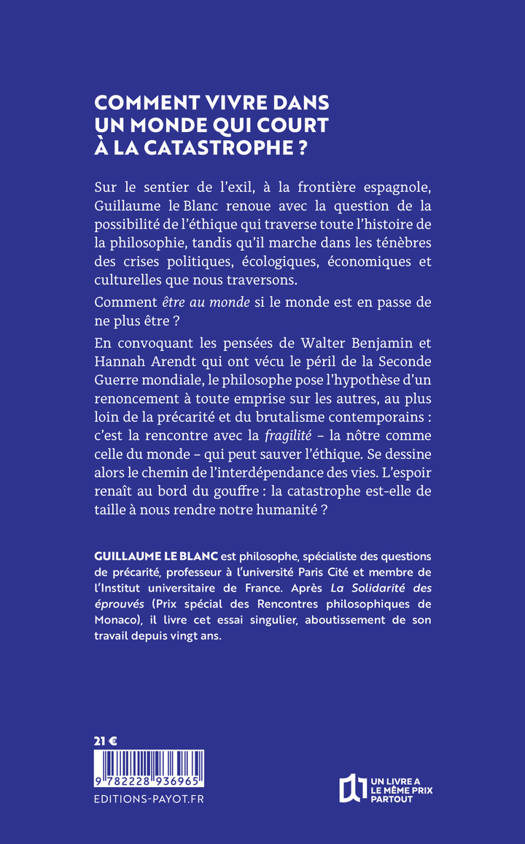 Quelles sont les règles à suivre pour vivre bien quand tout va mal ? Guillaume le Blanc cherche des réponses dans les pas de Benjamin et Arendt aux prises avec la catastrophe de l'Holocauste. L'objectif de ce livre est de proposer une éthique de la vie fragile, seule à même de s'opposer au dispositif généralisé de la précarité sociale, économique, politique et existentielle.