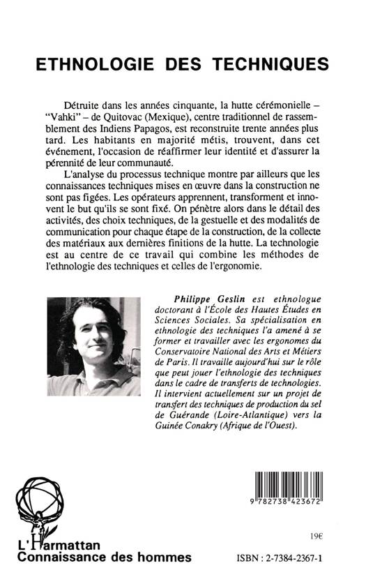 Détruite dans les années cinquante, la hutte cérémonielle -"Vahki" - de Quitovac (Mexique), centre traditionnel de rassemblement des Indiens Papagos, est reconstruite trente années plus tard. Les habitants en majorité métis, trouvent, dans cet événement, l'occasion de réaffirmer leur identité et d'assurer la pérennité de leur communauté. L'analyse du processus technique montre par ailleurs que les connaissances techniques mises en œuvre dans la construction ne sont pas figées. Les opérateurs apprennent, transforment et innovent le but qu'ils se sont fixé. On pénètre alors dans le détail des activités, des choix techniques, de la gestuelle et des modalités de communication pour chaque étape de la construction, de la collecte des matériaux aux dernières finitions de la hutte. La technologie est au centre de ce travail qui combine les méthodes de l'ethnologie des techniques et celles de l'ergonomie.