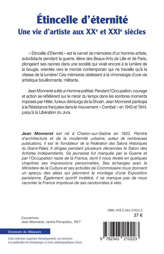 Etincelle d'Eternité est le carnet de mémoires d'un homme-artiste, autodidacte pendant la guerre, élève des Beaux-Arts de Lille et de Paris, plongeant ses racines dans une société qui vivait encore à la lumière de la bougie, orientée vers le monde contemporain qui ne travaille qu'à la vitesse de la lumière ! Ces mémoires obéissent à la chronologie d'une vie artistique bouillonnante, militante.Jean Monneret a été un homme politisé. Pendant l'Occupation, courage et action se reflétèrent sur le miroir du temps dans les sombres moments imposés par Hitler, furieux démiurge de la Shoah. Jean Monneret participa à la Résistance française dans le mouvement Combat en 1943 et 1944, jusqu'à la Libération du Jura.