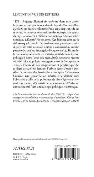 1871 : Auguste Blanqui est enfermé dans une prison bretonne cernée par la mer, dans la baie de Morlaix. Alors que la Commune enflamme Paris en s'inspirant de ses oeuvres, le penseur révolutionnaire occupe son temps d'emprisonnement à élaborer une vaste spéculation astronomique, L'Éternité par les astres. Cet homme écrit sur le ciel alors que le peuple n'a jamais été aussi près de ses droits. À partir de cette situation unique d'énonciation, un brin paradoxale, une intuition guide l'enquête de Léa Bismuth : la nuit étoilée serait-elle un véritable outil d'émancipation politique ? Entre l'essai et le récit, Étoiles communes raconte cette histoire au présent, voyageant entre la Bretagne et le Texas, à l'heure de l'astrocapitalisme et pendant que des milliers de satellites hantent l'orbite basse. Serait-il possible de monter des barricades cosmiques ? s'interroge l'autrice. Une constellation résistante se dessine dans l'obscurité : celle de la puissance de l'intelligence-artiste, seule en mesure désormais de se soulever et d'écrire un contrat sidéral. Vers une écologie politique et cosmique.