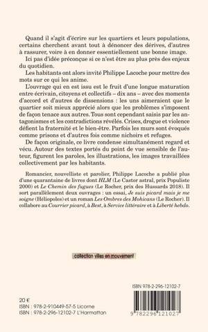 Quand il s'agit d'écrire sur les quartiers et leurs populations, certains cherchent avant tout à dénoncer des dérives, d'autres à rassurer, voire à en donner essentiellement une bonne image. Ici pas d'idée préconçue si ce n'est être au plus près des enjeux du quotidien. Les habitants ont alors invité Philippe Lacoche pour mettre des mots sur ce qui les anime. L'ouvrage qui en est issu est le fruit d'une longue maturation entre écrivain, citoyens et collectifs dix ans avec des moments d'accord et d'autres de dissensions : les uns aimeraient que le quartier soit mieux apprécié alors que les problèmes s'imposent de façon tenace aux autres. Tous sont cependant saisis par les antagonismes et les contradictions révélés. Crises, drogue et violence défient la fraternité et le bien-être. Parfois les murs sont évoqués comme prisons et d'autres fois comme nichoirs et refuges. De façon originale, ce livre condense simultanément regard et vécu. Autour des textes portés du point de vue sensible de l'auteur, figurent les paroles, les illustrations, les images travaillées collectivement par les habitants.