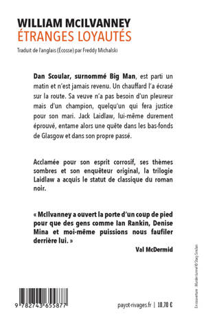 Dan Scoular, Big Man, est parti un matin et n'est jamais revenu. Un chauffard l'a écrasé sur la route. Sa veuve n'a pas besoin d'un pleureur, mais d'un champion, quelqu'un qui fera justice pour son mari. Jack Laidlaw relève le gant. Lui-même est au-delà des larmes. Son frère est mort et il cherche à comprendre pourquoi : suicide, accident ou meurtre ? Au cours de sa quête, Laidlaw croise les fantômes de son passé : rêves de jeunesse déçus, amours perdues et ces étranges loyautés personnelles qui amènent les êtres à trahir les idéaux qu'ils s'étaient promis."Au pas hésitant de Laidlaw, entre humour et amertume, désenchantement et obstination, le lecteur avance dans ce labyrinthe virtuose, toujours à hauteur d'homme."(Bertrand Audusse, Le Monde)