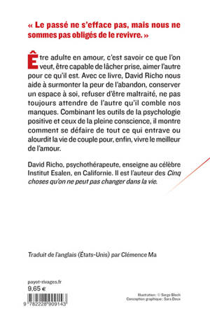 Être adulte en amour, c'est savoir ce que l'on veut, être capable de lâcher prise, aimer l'autre pour ce qu'il est. Avec ce livre, David Richo nous aide à surmonter la peur de l'abandon, conserver un espace à soi, refuser d'être maltraité, ne pas toujours attendre de l'autre qu'il comble nos manques. Combinant les outils de la psychologie positive et ceux de la plaine conscience, il montre comment se défaire de tout ce qui entrave ou alourdit la vie de couple pour, enfin, vivre le meilleur de l'amour.