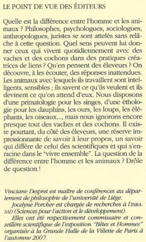 Un essai qui interroge la différence entre l'homme et les animaux, remettant en question la rupture entre nature et culture, et ce qui fonde "le propre de l'homme", pour retrouver un lieu où des relations particulières et concrètes avec les animaux produisent des connaissances et construisent des identités.