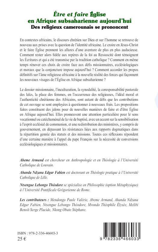 En contextes africains, le discours chrétien sur Dieu et sur l'homme se retrouve de nouveau aux prises avec la question de l'identité africaine. Le croire en Jésus-Christ et le faire Église prennent les allures d'une aventure de plus en plus audacieuse. Comment rester alors fidèle aux repères de la foi au Ressuscité dont témoignent les Écritures et qui a été transmise par la tradition catholique ? Comment en même temps rénover ces choix de croire face aux défis missionnaires, ecclésiologiques et moraux que la conjoncture impose aujourd'hui ? Comment accorder les propos définitifs sur l'âme religieuse africaine à la nouvelle réalité des forces qui façonnent les nouveaux visages de l'Église en Afrique subsaharienne ? Le dossier missionnaire, l'inculturation, la synodalité, la coresponsabilité pastorale des laïcs, la place des femmes, en l'occurrence des religieuses, l'idéal moral et l'authenticité chrétienne des Africains, sont autant de défis que les contributions de cet ouvrage se sont employées à questionner à nouveaux frais. Les propositions faites constituent des jalons pour de nouvelles manières de faire et d'être Église en Afrique aujourd'hui. Elles promeuvent une attention particulière pour le sens vocationnel ou catéchuménal de la vie de baptisé, avec un accent sur la sensibilisation à l'esprit ecclésial de communion, et une redistribution des ministères, y compris de gouvernement, en dépassant les résistances liées aux rapports dogmatiques dans la répartition genrée des statuts et des missions. Toutes ces réflexions répondent d'une certaine manière à l'appel du pape François sur la nécessité de conversions ecclésiologiques et missionnaires.