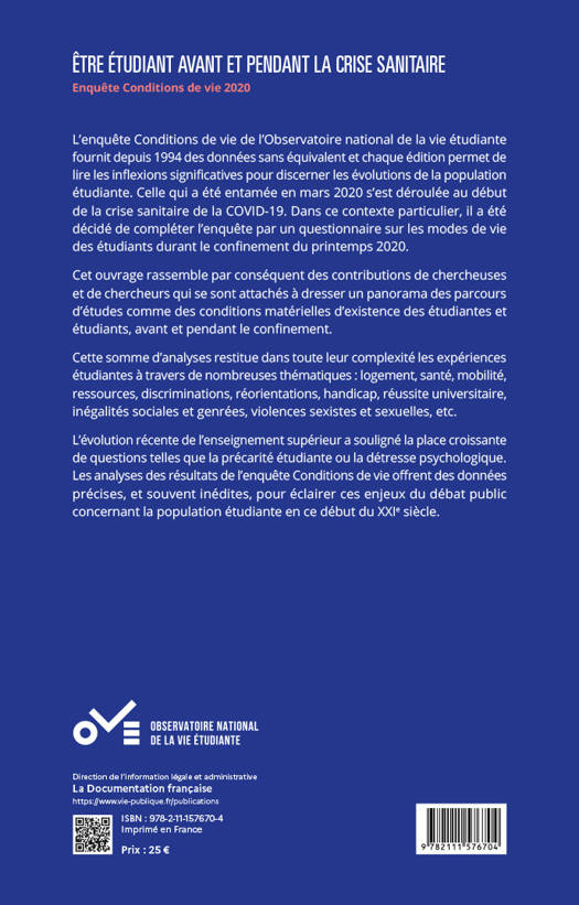Les résultats présentés dans cet ouvrage s’appuient sur la neuvième enquête nationale, « Conditions de vie » qui a été réalisée en 2020 auprès de 60 000 étudiants et sur l’enquête « La vie d’étudiant confiné », réalisée en juin 2020 auprès de 6300 étudiants. Cette dernière donne des informations sur ce que les épisodes de confinement peuvent changer aux modes de vie et d’étude. Ces transformations des manières d’étudier (et l’isolement associé) ont suscité de nouvelles interrogations quant aux incidences de la pandémie sur les modes de vie des étudiants. Les réponses des étudiants renseignent sur les grandes tendances de leurs conditions de vie et sur certaines thématiques nouvellement introduites dans l’enquête (telles que les violences sexuelles dans l’enseignement supérieur, le racisme et les discriminations, l’utilisation du numérique dans l’accès à l’emploi, ou encore l’usage des bibliothèques).