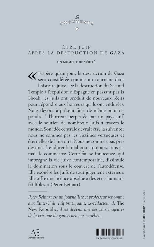 « J'espère qu'un jour, la destruction de Gaza sera considérée comme un tournant dans l'histoire juive. De la destruction du Second Temple à l'expulsion d'Espagne en passant par la Shoah, les Juifs ont produit de nouveaux récits pour répondre aux horreurs qu'ils ont endurées. Nous devons à présent faire de même pour répondre à l'horreur perpétrée par un pays juif, avec le soutien de nombreux Juifs à travers le monde. Son idée centrale devrait être la suivante : nous ne sommes pas les victimes vertueuses et éternelles de l'histoire. Nous ne sommes pas prédestinés à endurer le mal pour toujours, sans jamais le commettre. Cette fausse innocence, qui imprègne la vie juive contemporaine, dissimule la domination sous le couvert de l'autodéfense. Elle exonère les Juifs de tout jugement extérieur. Elle offre une licence absolue à des êtres humains faillibles. » (Peter Beinart)