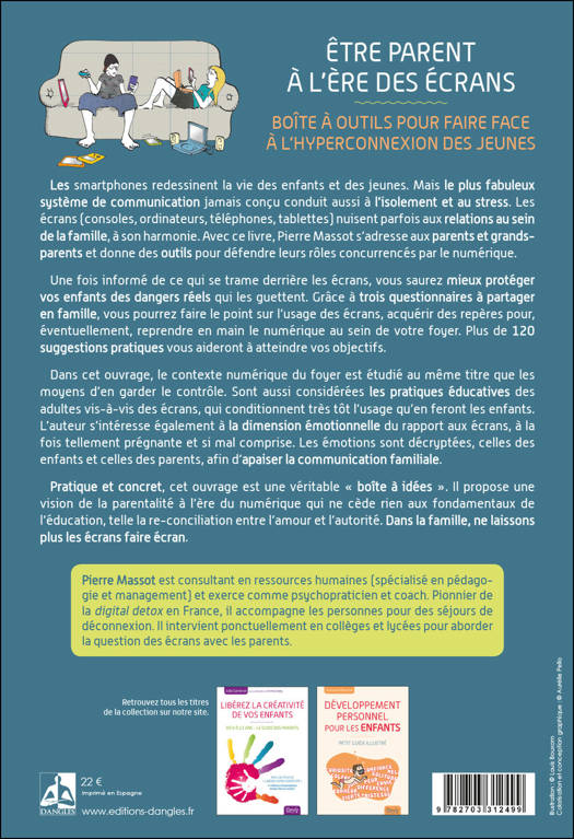 Les smartphones redessinent la vie des enfants et des jeunes. Mais le plus fabuleux système de communication jamais conçu conduit aussi à l’isolement et au stress. Les écrans (consoles, ordinateurs, téléphones, tablettes) nuisent parfois aux relations au sein de la famille, à son harmonie. Avec ce livre, Pierre Massot s’adresse aux parents et grands-parents et donne des outils pour défendre leurs rôles concurrencés par le numérique. Une fois informé de ce qui se trame derrière les écrans, vous saurez mieux protéger vos enfants des dangers réels qui les guettent. Grâce à trois questionnaires à partager en famille, vous pourrez faire le point sur l’usage des écrans, acquérir des repères pour, éventuellement, reprendre en main le numérique au sein de votre foyer. Plus de 120 suggestions pratiques vous aideront à atteindre vos objectifs. Dans cet ouvrage, le contexte numérique du foyer est étudié au même titre que les moyens d’en garder le contrôle. Sont aussi considérées les pratiques éducatives des adultes vis-à-vis des écrans, qui conditionnent très tôt l’usage qu’en feront les enfants. L’auteur s’intéresse également à la dimension émotionnelle du rapport aux écrans, à la fois tellement prégnante et si mal comprise. Les émotions sont décryptées, celles des enfants et celles des parents, afin d’apaiser la communication familiale. Pratique et concret, cet ouvrage est une véritable « boîte à idées ». Il propose une vision de la parentalité à l’ère du numérique qui ne cède rien aux fondamentaux de l’éducation, telle la re conciliation entre l’amour et l’autorité. Dans la famille, ne laissons plus les écrans faire écran.
