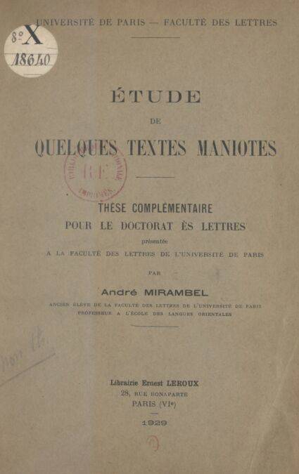 Thèse complémentaire de Doctorat ès lettres présentée à la Faculté des lettres de l'Université de Paris