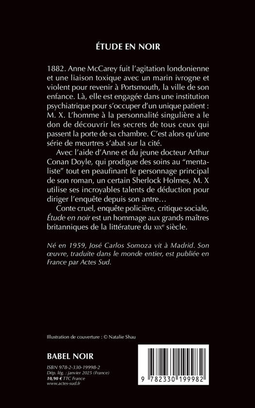1882. Anne McCarey fuit l'agitation londonienne et une liaison toxique avec un marin ivrogne et violent pour revenir à Portsmouth, la ville de son enfance. Là, elle est engagée dans une institution psychiatrique pour s'occuper d'un unique patient : M. X. L'homme à la personnalité singulière a le don de découvrir les secrets de tous ceux qui passent la porte de sa chambre. C'est alors qu'une série de meurtres s'abat sur la cité. Avec l'aide d'Anne et du jeune docteur Arthur Conan Doyle, qui prodigue des soins au "mentaliste" tout en peaufinant le personnage principal de son roman, un certain Sherlock Holmes, M. X utilise ses incroyables talents de déduction pour diriger l'enquête depuis son antre... Conte cruel, enquête policière, critique sociale, "Étude en noir" est un hommage aux grands maîtres britanniques de la littérature du XIXe siècle.