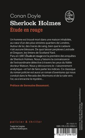 Un homme est trouvé mort dans une maison inhabitée, au coeur d'un des plus sinistres quartiers de Londres. Autour de lui, des traces de sang, bien que le cadavre n'ait aucune blessure. De quoi laisser perplexes Lestrade et Gregson, les limiers de Scotland Yard. Parue en 1887, cette Étude en rouge est la première des enquètes de Sherlock Holmes. Nous y faisons la connaissance de l'extraordinaire détective à travers les yeux du bon Dr Watson. Nous y apprenons le « raisonnement analytique» et l'art de faire parler les indices. Ce classique du roman policier est aussi un roman d'aventures qui nous conduit dans le Nevada des mormons et de la ruée vers l'or, où s'enracine le mystère...